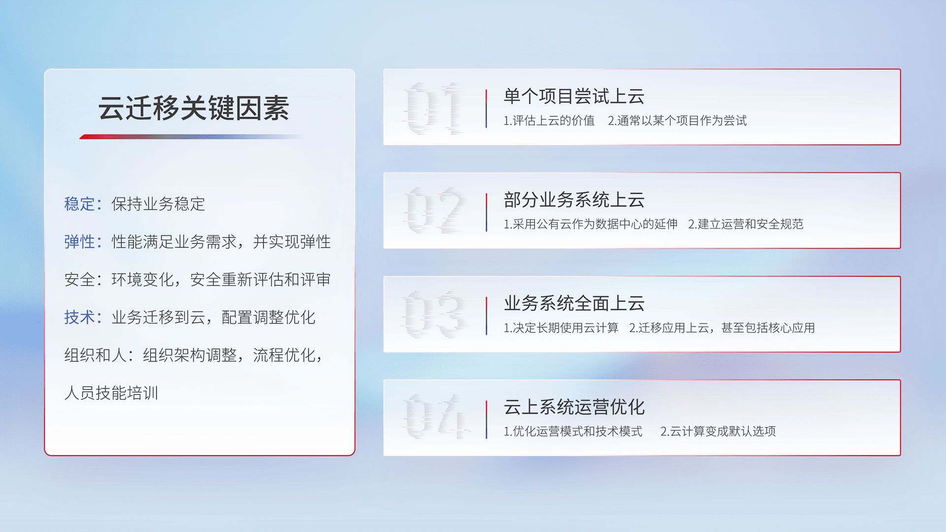 结合实际业务,,从规划设计、、、、云平台选型、、、云原生改造、、、数据迁移、、、集成交付,,,迁移全过程为客户识别最佳上云路径,,做好风险识别管理,,,,设计网络架构、、、、身份权限、、安全审计合规、、、、操作审计、、、、日志审计、、、监控告警策略、、、多站点容灾设计等,,,对云上基础设施进行整体规划,,,提升IT治理水平,,,以满足弹性、、、高可用、、、高性能的需求。。。。