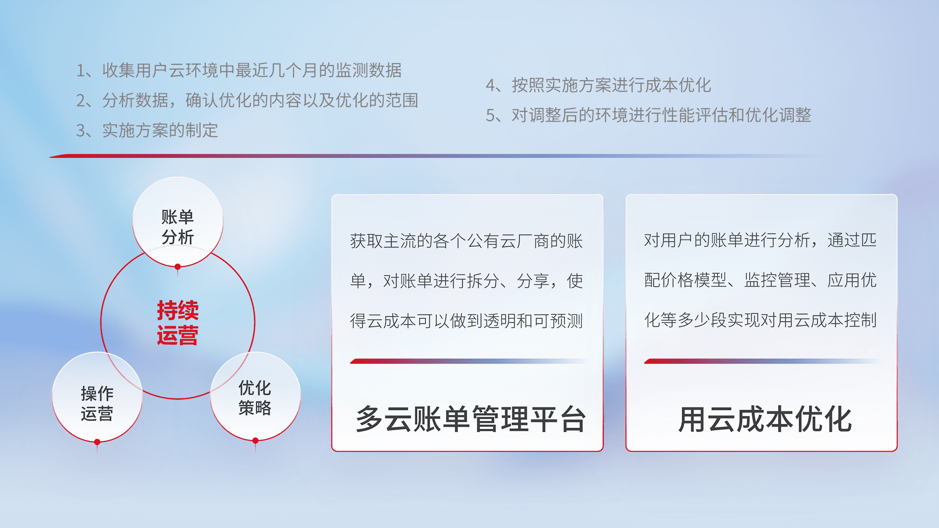 通过多云纳管,,,以统一的资源数据模型把客户的云资源进行抽象和封装,,,进而实现对多云资源的统一操作,,保障云资源管理的可靠性、、、稳定性与可用性。。。。量身定制化运维内容,,,,配置、、、、开发运维、、补丁管理、、、、备份、、监控、、认证和访问管理、、、、审计和日常巡检等,,,保障在用云过程中的可靠度,,,稳定度以及高可用率。。